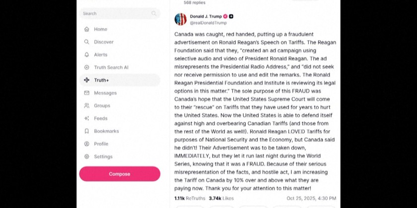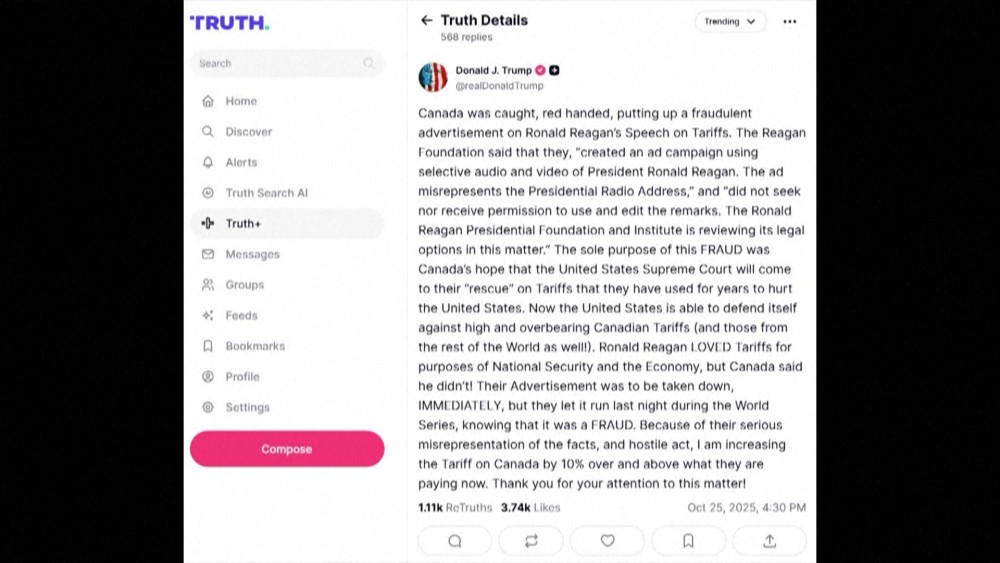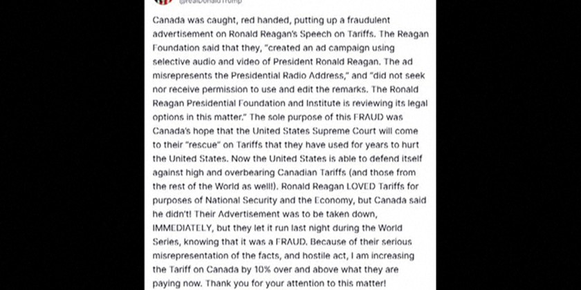 Trump accused it of misleading and threatened on Thursday to end trade talks with Canada. Ontario Premier Doug Ford said he would pause the ad, broadcast during the first game of the World Series on Friday night, after the weekend, according to media reports.