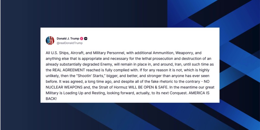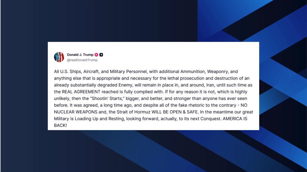 In his Truth Social post Trump said "All U.S. Ships, Aircraft, and Military Personnel, with additional Ammunition, Weaponry, and anything else that is appropriate and necessary for the lethal prosecution and destruction of an already substantially degraded enemy, will remain in place in, and around, Iran, until such time as the REAL AGREEMENT reached is fully complied with. If for any reason it is not, which is highly unlikely, then the “Shooting’ Starts,” bigger, and better, and stronger than anyone has ever seen before.