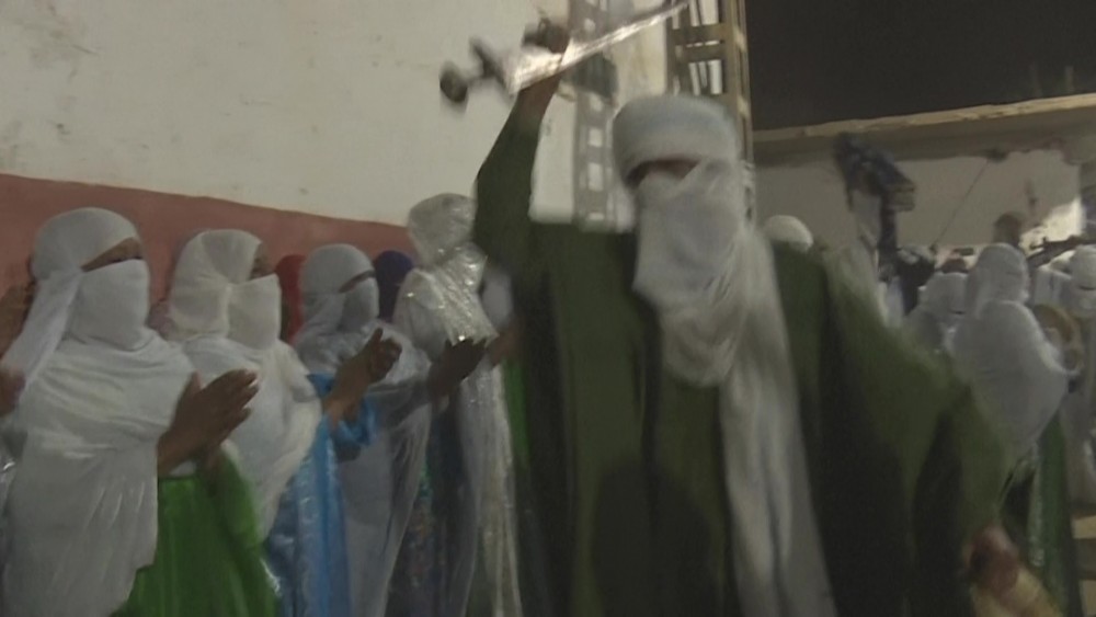 Men perform a traditional dance as women sing during the Sebeiba Festival, a yearly celebration of Tuareg culture, in the oasis town of Djanet in southeastern Algeria.