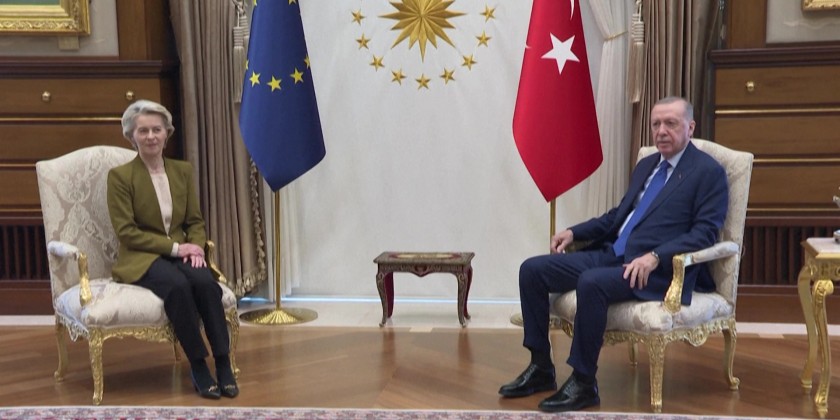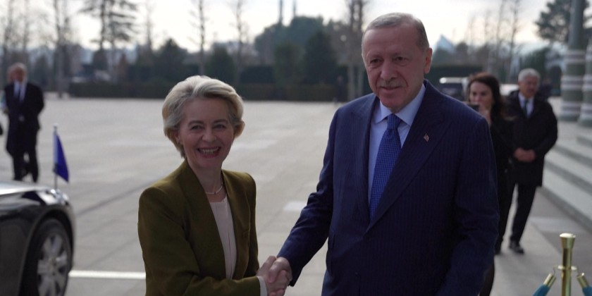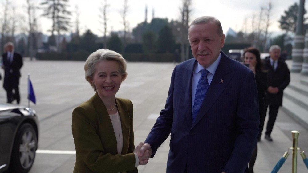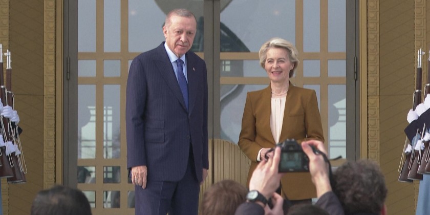 Turkish President Recep Tayyip Erdogan welcomed EU Commission chief Ursula von der Leyen ahead of talks in Ankara on Tuesday.