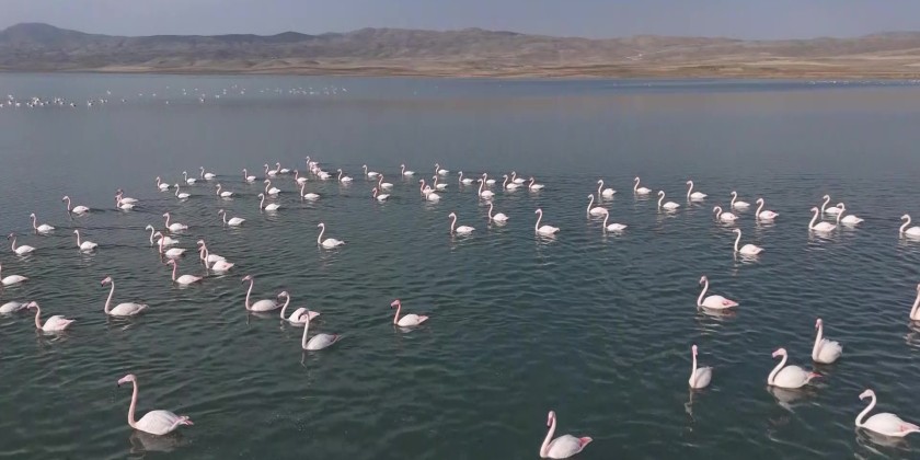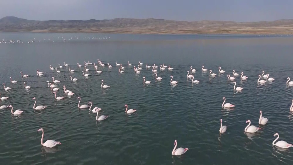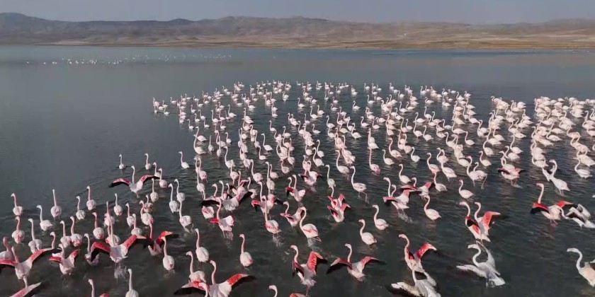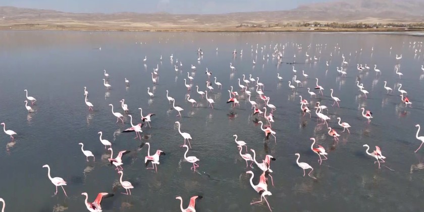 Erçek Lake, located in eastern Van of Turkiye, has once again become a key stopover point for flamingos during their annual migration. The birds, a favourite among nature enthusiasts, have extended their stay this year as temperatures in the region remain above seasonal norms. Flamingos creating a striking visual spectacle on Erçek Lake were also captured from the air by drone.