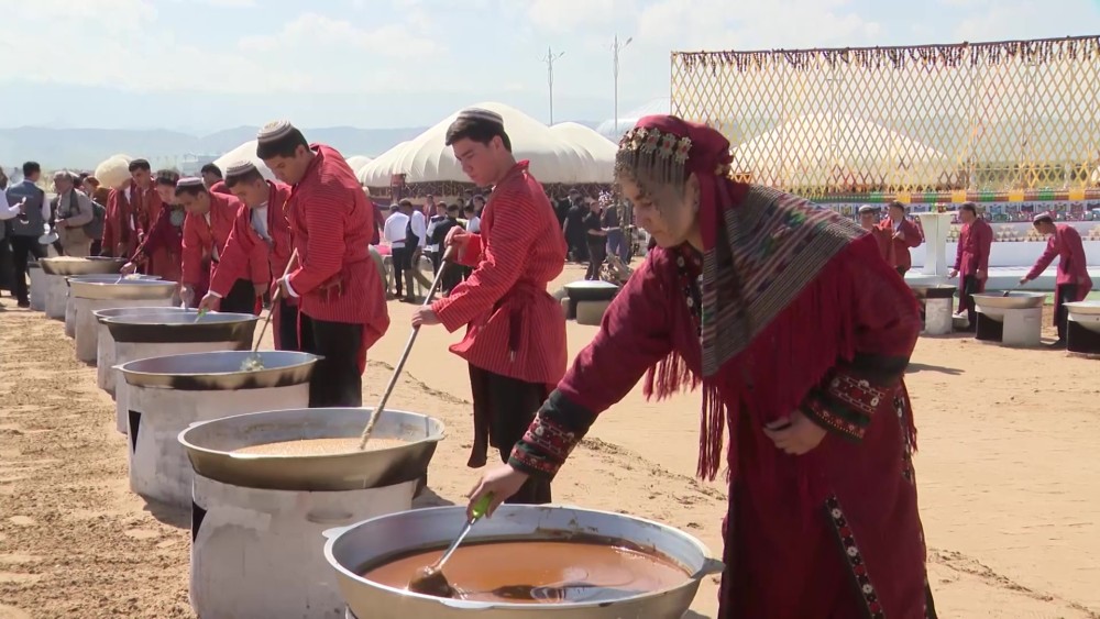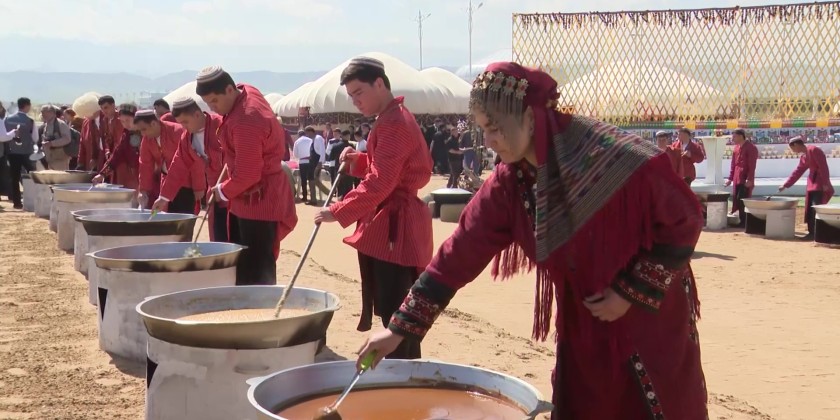 Celebrations take place in the foothills of the Kopetdag Mountains. Dances in traditional costumes take place near snow-white yurts, meat is cooked over a fire, and carpets are sold in the palaces. National songs and poems dedicated to the holiday are recited.
