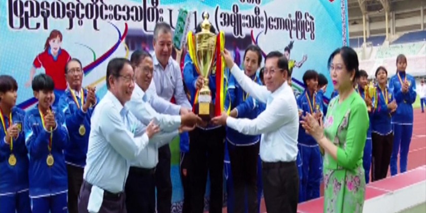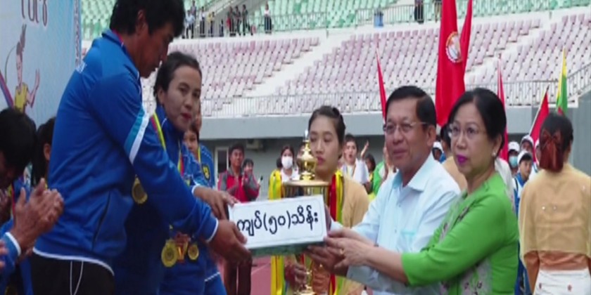 Joint Secretary of the SAC Lt-Gen Ye Win Oo then presented medals individually to the first winning Mandalay Region team. SAC Chairman Prime Minister Senior General Min Aung Hlaing and wife then presented honoraria and championship trophy to the 1st winning Mandalay region team and cordially greeted the athletes.