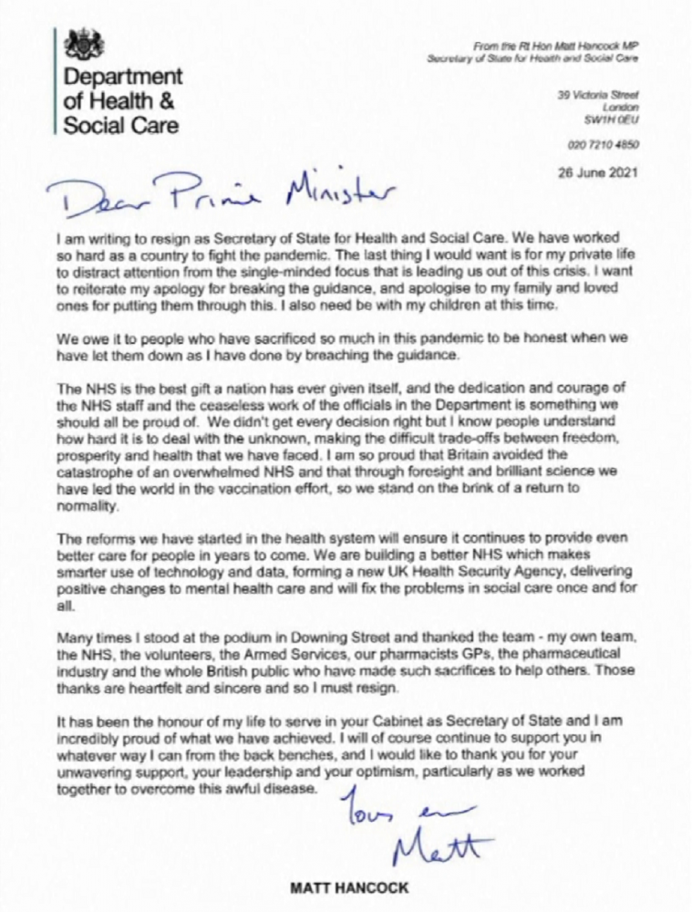 UK Health Secretary Matt Hancock resigned on Saturday after he admitted breaching virus restrictions. The Sun newspaper ran images appearing to show the married Hancock and a senior aide embracing in an office at the Department of Health. It said the closed-circuit television images were taken May 6. That was 11 days before lockdown rules were eased to allow hugs and other physical contacts with people outside one’s own household. UK Prime Minister Boris Johnson said he was "sorry" to receive Hancock's resignation as Health Secretary. Hancock, who has led the country’s response to the coronavirus pandemic, was the latest in a string of government officials to be accused of breaching restrictions imposed on the rest of the population to control the spread of the coronavirus.