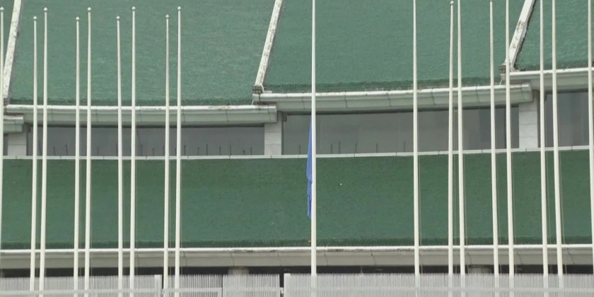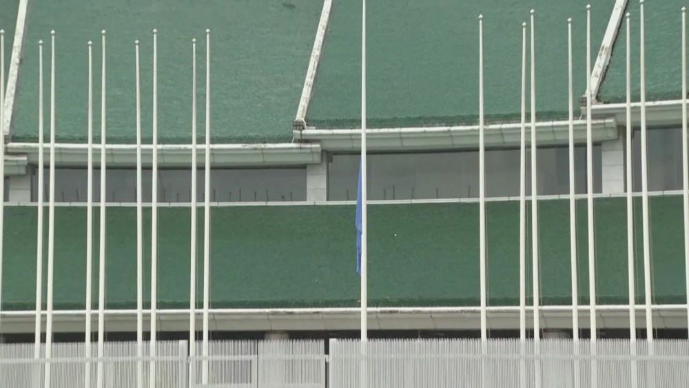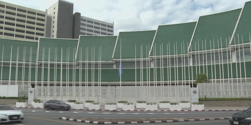 The United Nations' flag is lowered to half-mast at the UN Bangkok office which hosts 21 UN agencies to commemorate its staff who have been killed and wounded in strikes in Gaza.