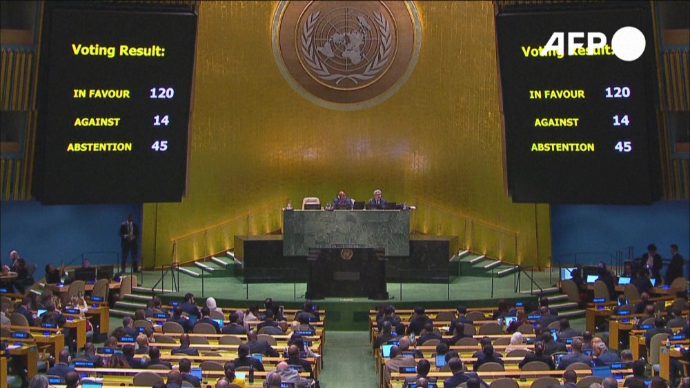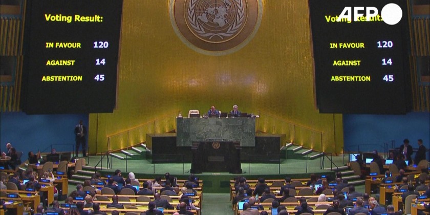 The UN General Assembly emergency session held on the Israeli-Palestinian conflict in New York. On Friday, the UN General Assembly adopted a resolution seeking an immediate "humanitarian truce" in Gaza, as the Israel-Hamas conflict raged for 21st day. The nonbinding resolution, criticized by Israel and the United States for failing to mention Hamas, received 120 votes in favor, 14 against and 45 abstentions.