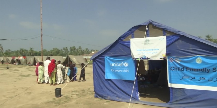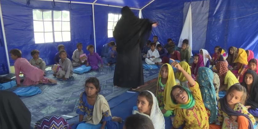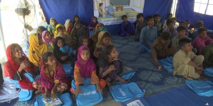 A temporary school set up in tents by UNICEF in collaboration with Sindh government is providing education to around 200 children of flood-affected families in Khairpur city. Teachers in this school, which has attracted children from families living in around 150 tents, are providing lessons in basic mathematics, language, and drawing.