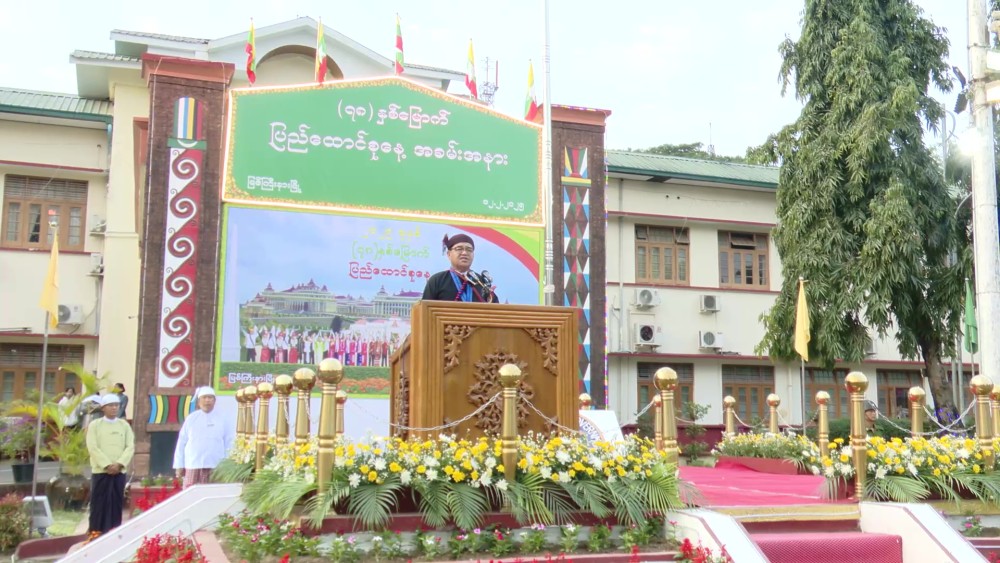 Following this, at 7 a.m., the message-reading ceremony continued. The message sent by the Chairman of the State Administration Council Prime Minister Senior General Thadoe Maha Thray Sithu Thadoe Thiri Thudhamma Min Aung Hlaing, for the 78th Anniversary Union Day commemorative event, was read by the State Chief Minister U Khat Htein Nan.
