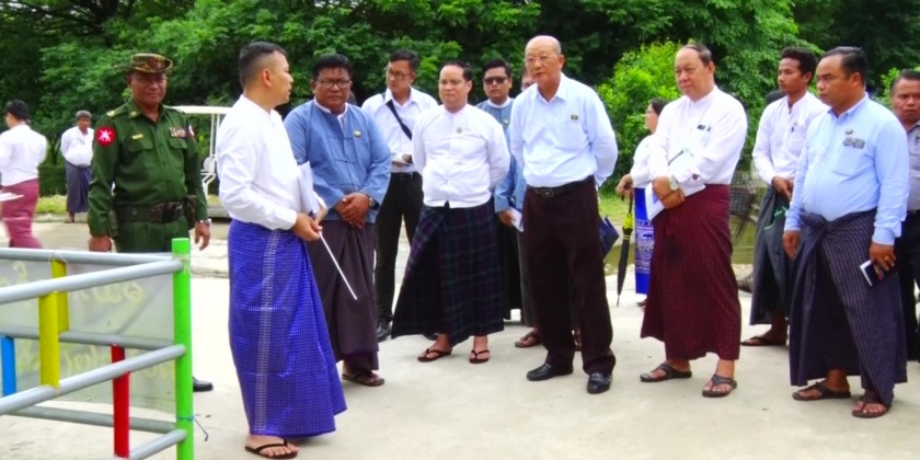 After attending the Kayin Traditional White Thread Tying (Wrist Tying) Ceremony, Union Minister for Ethnic Affairs Jeng Phang Naw Taung, along with officials, inspected the construction of the Pontoon Bridge in the Union National Races Village.