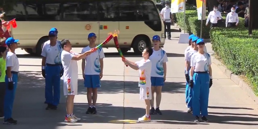 Chinese Vice Premier Ding Xuexiang lit the torch from a cauldron at the launch ceremony held at the Centennial Lecture Hall of Peking University, then handed it to the first torchbearer Zou Jingyuan, 2020 Olympic champion from Sichuan Province.