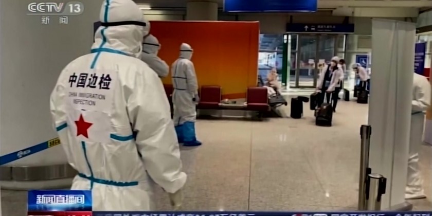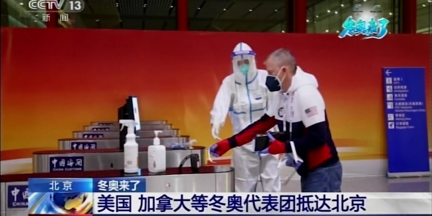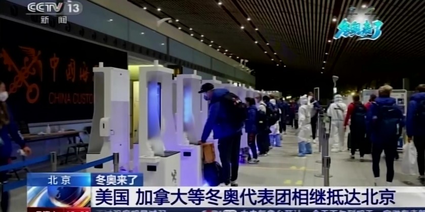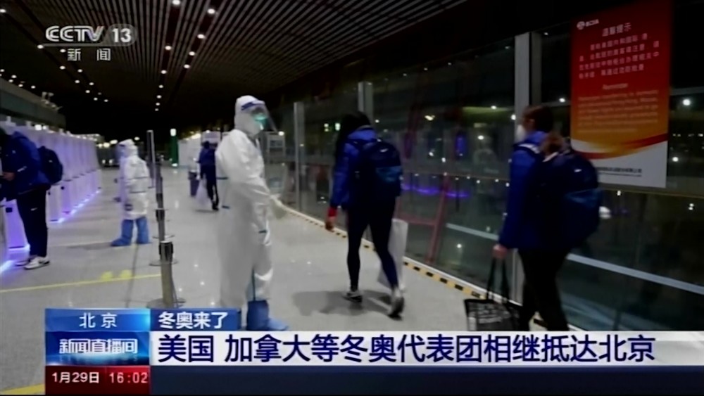Chinese state broadcaster CCTV released images of the US and Canadian teams going through quarantine procedures with Chinese immigration and customs staff in protective suits.