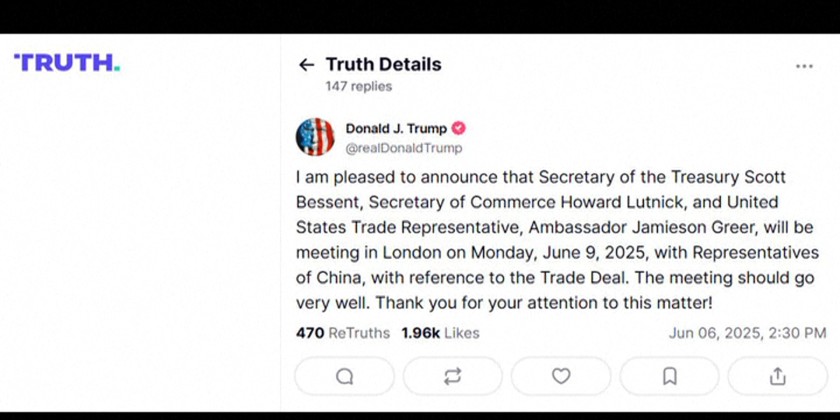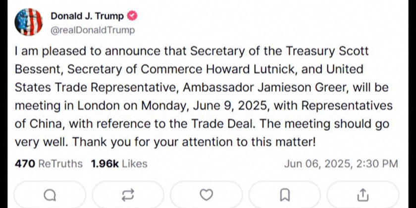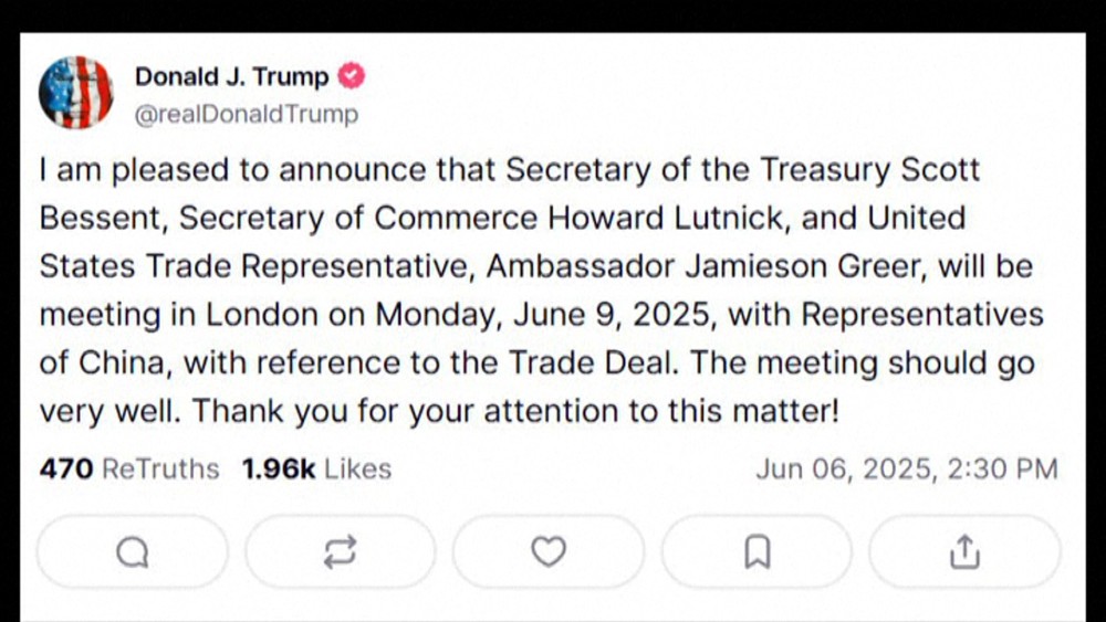 The meeting will be held in London. However, he has struck a different tone since the call with President Xi Jinping on Thursday. He said relations are back on track and negotiations for the trade deal are in "good shape." A media has quoted sources as saying the rare-earths issue may be easing as well. It says China has granted temporary export licenses to the entities that supply the top three US automakers.