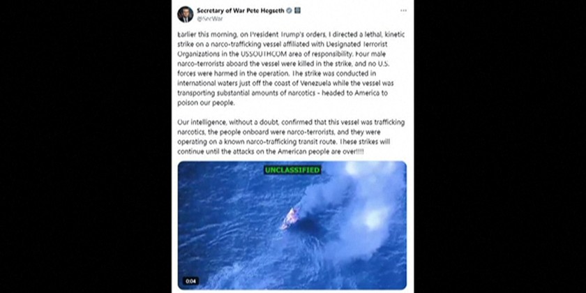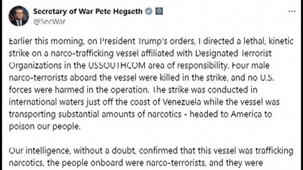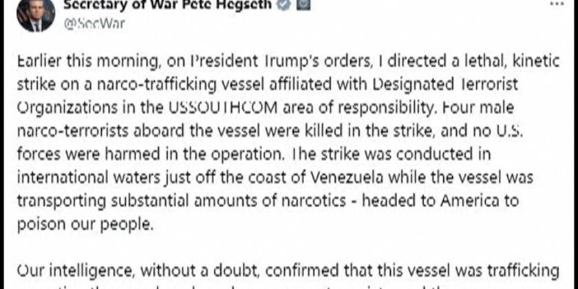 US President Donald Trump's administration said US forces have struck a drug-trafficking vessel headed to the country in waters off Venezuela, killing four people on board. US Defense Secretary Pete Hegseth wrote on social media that four male "narco-terrorists" aboard a "narco-trafficking vessel" affiliated with designated terrorist organizations were killed in the strike in international waters.
