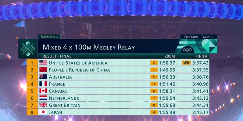 The United States broke the world record in winning the Olympic 4x100m mixed medley relay gold on Saturday, outgunning China and Australia. The team of US touched in 3min 37.43sec to narrowly better the mark set by Britain at the Tokyo Games, when the event was first added to the Olympic programme. China took silver and Australia bronze.