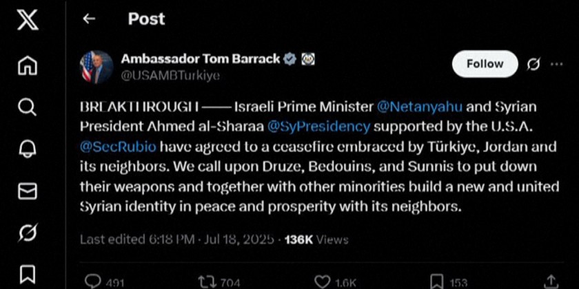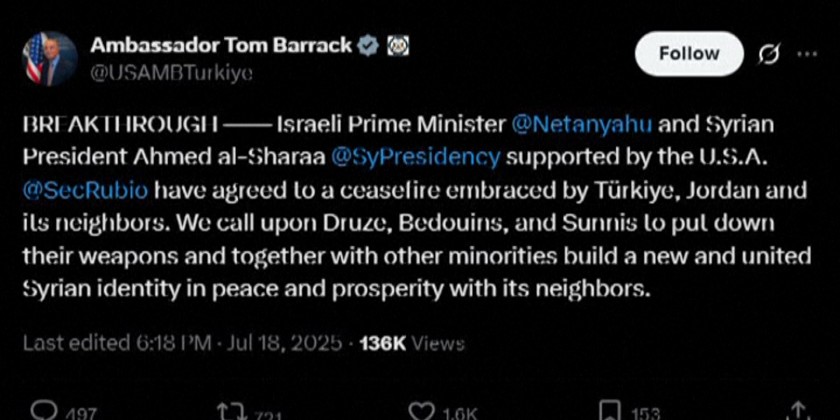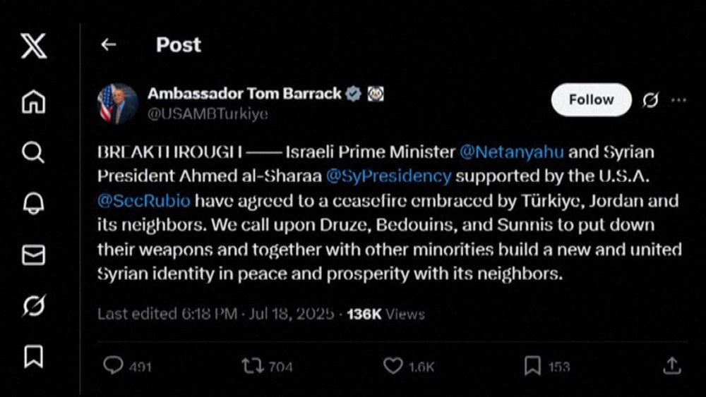 Israeli Prime Minister Netanyahu and Syria's new leader Ahmed al-Sharaa "have agreed to a ceasefire" also backed by neighbors Türkiye and Jordan, said Tom Barrack, the US ambassador to Turkey who is also point man on Syria.
