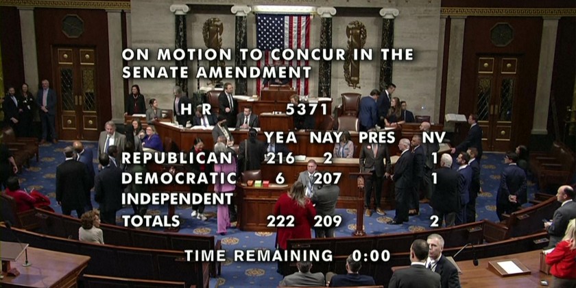 The U.S. House of Representatives on Wednesday night passed a Senate-approved spending package, ending the congressional deadlock that led to the longest government shutdown in U.S. history. The House voted 222-209 to pass the deal, two days after the Senate voted 60-40 to approve the spending package.