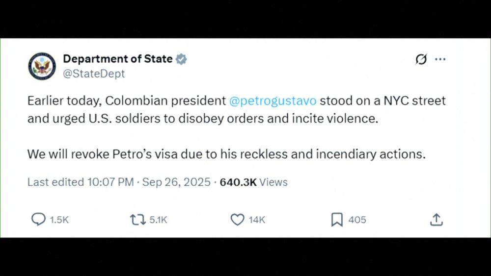 The US State Department said Friday it would revoke the visa of Colombia's leftist President Gustavo Petro for his "incendiary actions" during a pro-Palestinian street protest in New York. "Earlier today, Colombian president stood on a NYC street and urged US soldiers to disobey orders and incite violence," the State Department said in a social media.