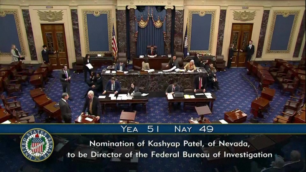 U.S. Senate on Thursday narrowly confirmed Kash Patel as the director of the Federal Bureau of Investigation (FBI). The upper chamber approved the nomination by vote of 51 to 49, with two Republicans joining all 47 Democrats in voting against Patel's nomination.