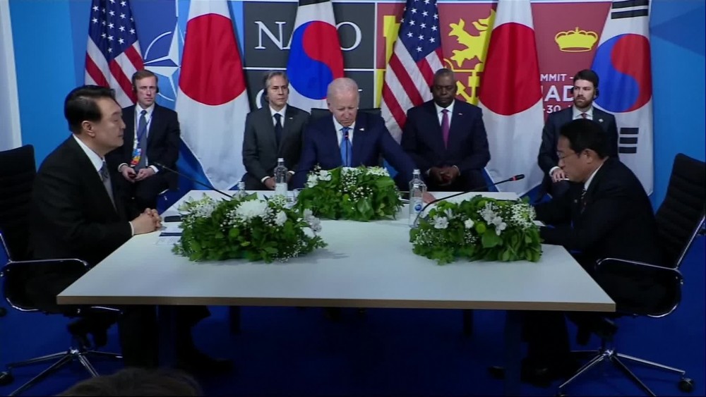 The leaders of the US, Japan and South Korea held talks on the sidelines of the NATO summit in Madrid on Wednesday.