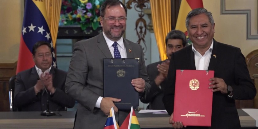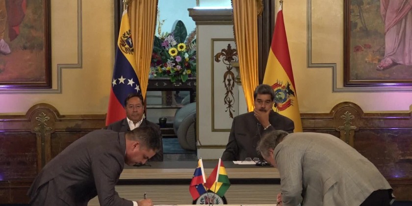 Venezuelan and Bolivian leaders on Thursday signed energy cooperation agreements during a meeting in the Miraflores presidential palace in Caracas. The 13 agreements would "unite" the national oil, gas, and petrochemical companies, said Venezuelan President Nicolás Maduro.