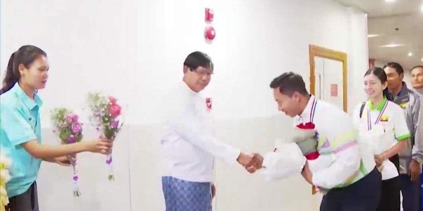 The Myanmar rowing team was welcomed by various dignitaries upon their return included Yangon Region Chief Minister U Soe Thein, along with members of the region Government, U Nyan Zaw Oo, Director-General of the Department of Sports and Physical Education under the Ministry of Sports and Youth Affairs, and other officials from the Department, the Chairman and officials of the Sports Support Committee, officials and athletes from Myanmar Rowing Federation, trainees from the Institute of Sports and Physical Education (Yangon) and sports enthusiasts and officials.