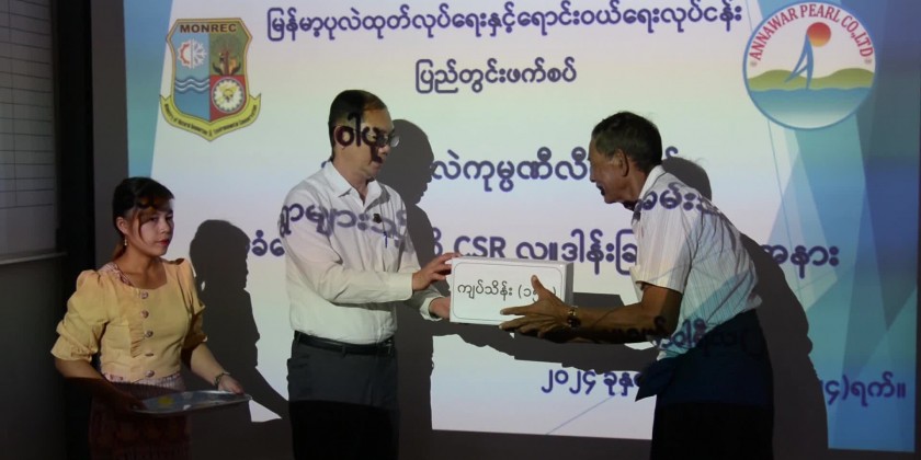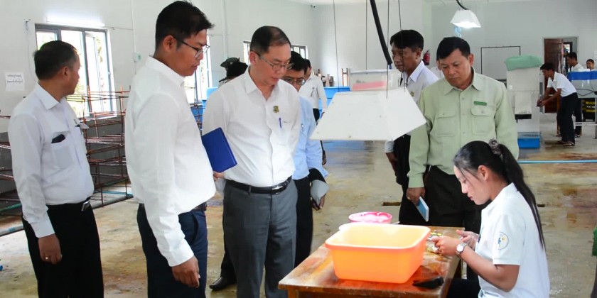 At Anawah Pearl Company in Kyunsu Township, the Union Minister discussed boosting pearl production through collaboration between the department and entrepreneurs, while also providing cash assistance for local infrastructure projects such as school renovations and rural clinic construction. They also observed pearl cultivation at incubation room.
