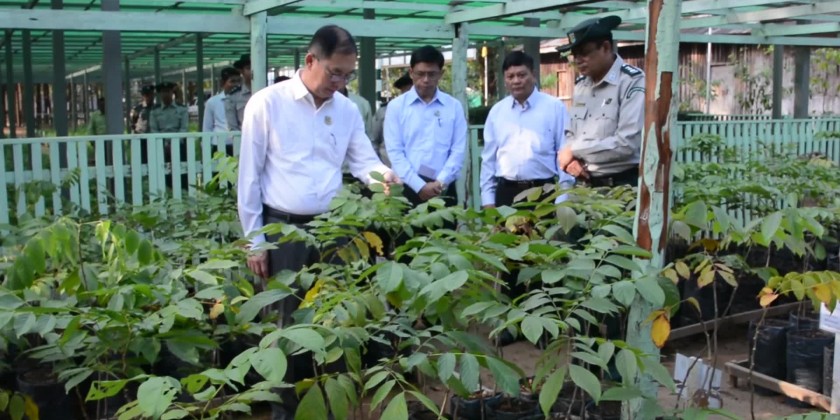 The Union Minister and party then proceeded to Shan Chaung Forest Nursery Garden, where they observed 68,000 saplings of various species destined for distribution during monsoon tree planting.