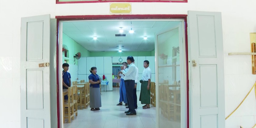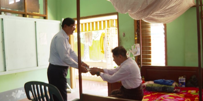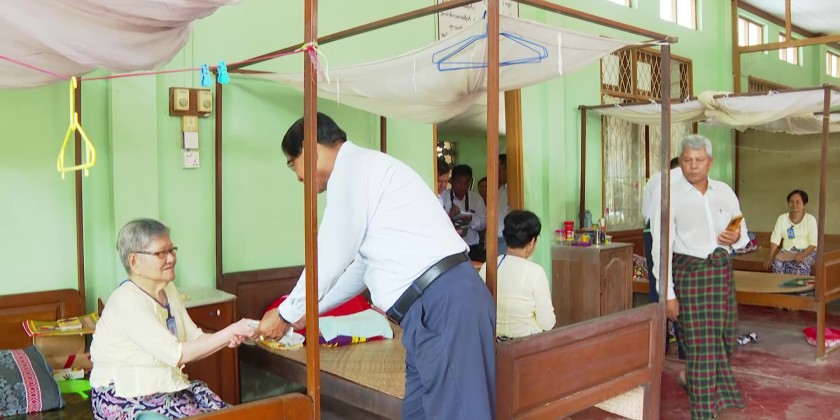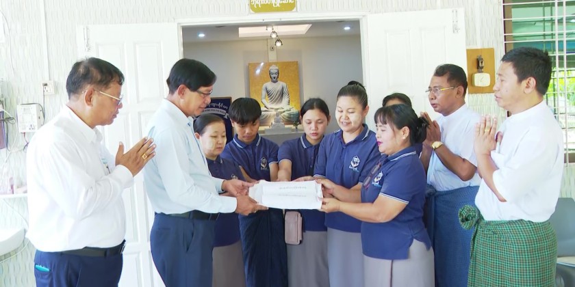 Next, the Chief Minister and officials proceeded to the Miba Gon Home for the Aged in Shwe Santaw Ward, Twantay Township. There, they warmly interacted with a total of 25 residents including 9 elderly men and 16 elderly women, personally delivering donations to each individual. They also toured the prayer hall and dining area, and further donations were made to the home's management committee on behalf of the Yangon Region Government. In return, the committee members presented a certificate of honor to the Chief Minister.
