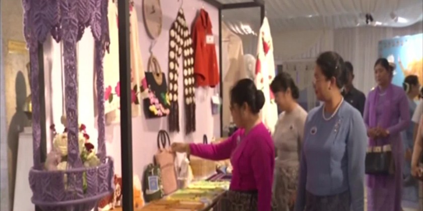 Next, the wife of SAC Vice Chairman Deputy Commander-In-Chief of Defense Commander-In-Chief (Army) together with the members visited handicraft exhibition booth displayed in commemoration of 76th Anniversary of Tatmadaw (Navy) at Thiri Maha Zayya Kyaw Htin Hall and observed the domestic handicrafts, fabric paintings and dresses created and designed by the family members of Tatmadaw (Navy) and the demonstration by wearing the dresses.