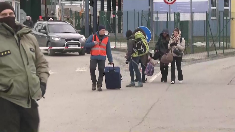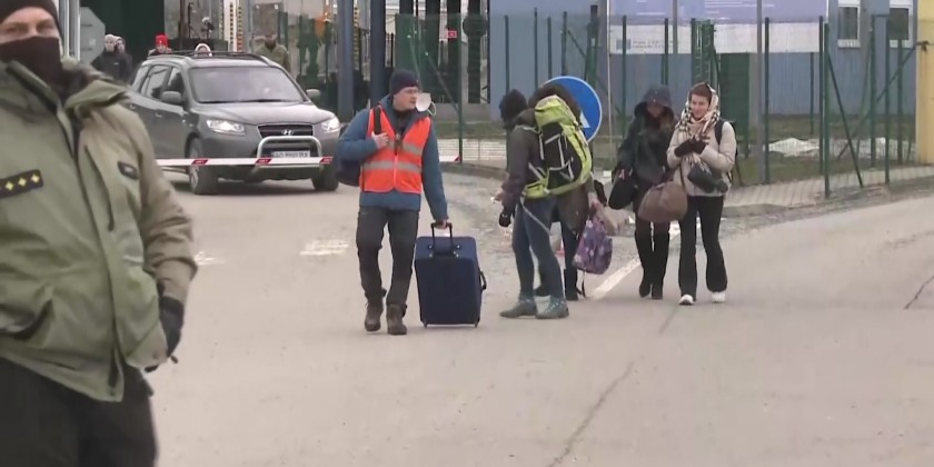 People continued to cross the border into Slovakia on Saturday as they fled from Ukraine. At least 150,000 people have fled Ukraine into other neighboring countries, the U.N. refugee agency said Saturday. Some walked many miles through the night while others fled by train, car or bus, forming lines miles long at border crossings.