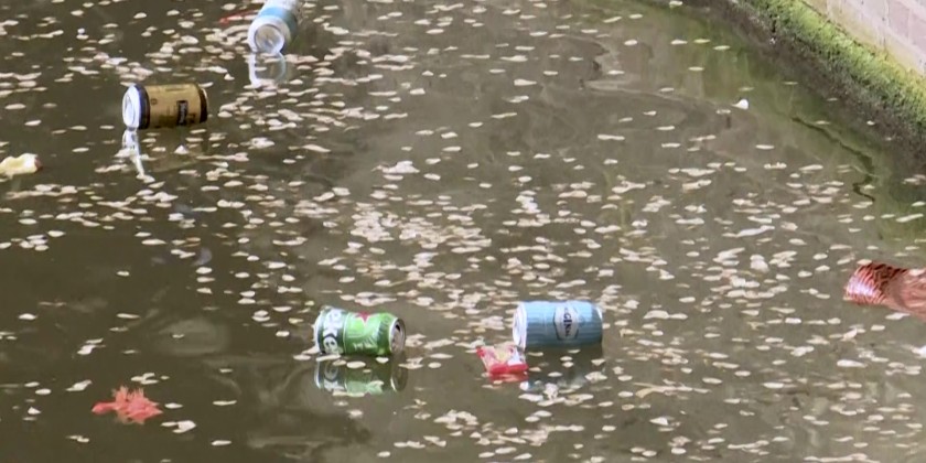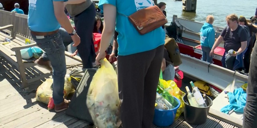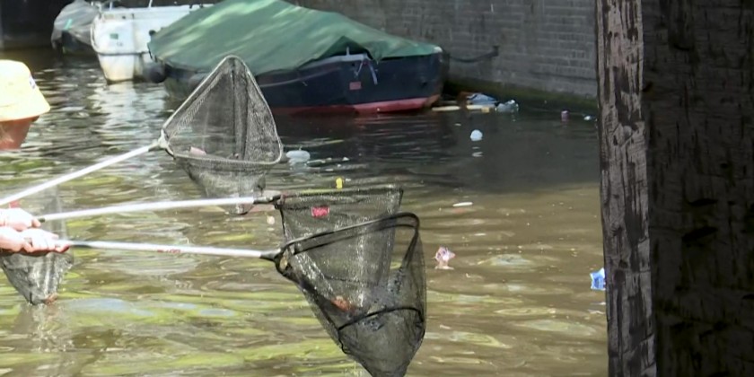 Every year, after Amsterdam’s King’s Day celebrations, the city’s canals are filled with plastic waste. To help clean up, Dutch company Plastic Whale organizes a canal clean-up event, with around 250 volunteers using nets to collect the plastic.