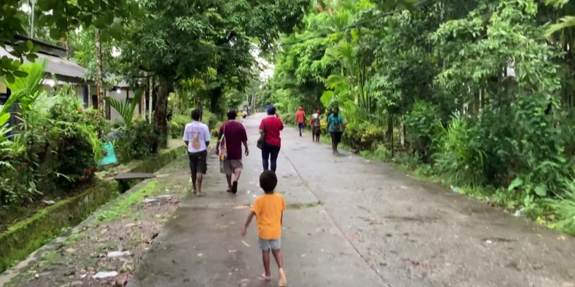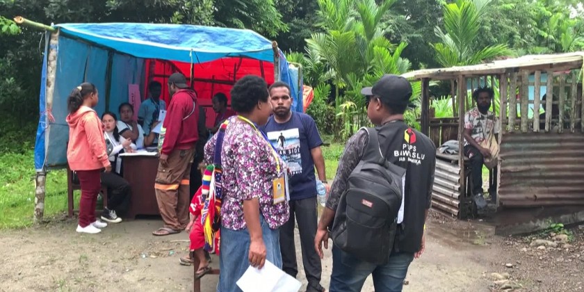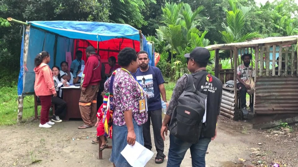 Voting begins in Indonesia's presidential, national and provincial elections. Voters start entering a polling station in the easternmost province of Papua province.