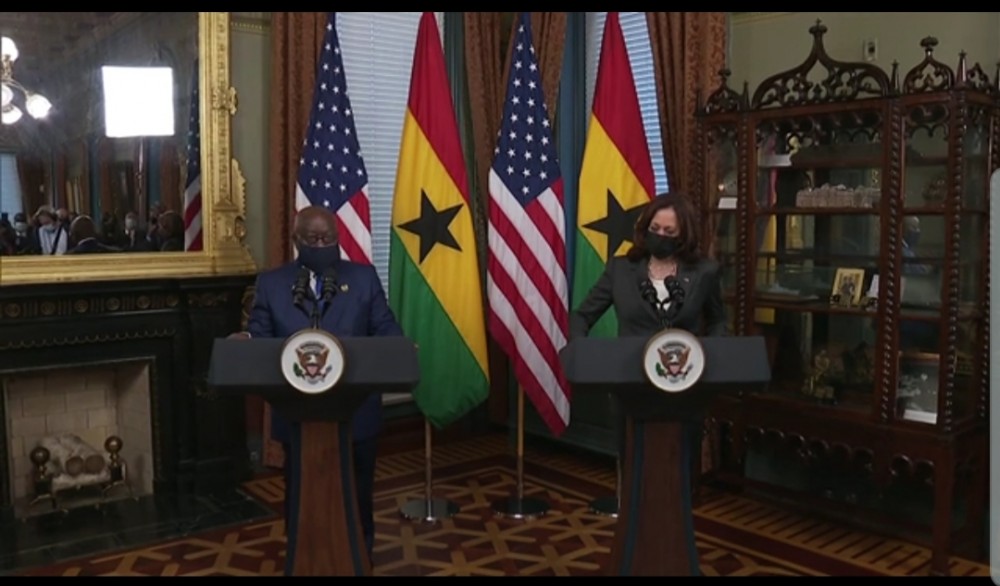 Harris held a photo-op with Akufo-Addo in the vice president's ceremonial office, saying to reporters that the bilateral relationship with Ghana began in 1957 and emphasized the "deep and historical ties" reflecting the African Diaspora in the United States.