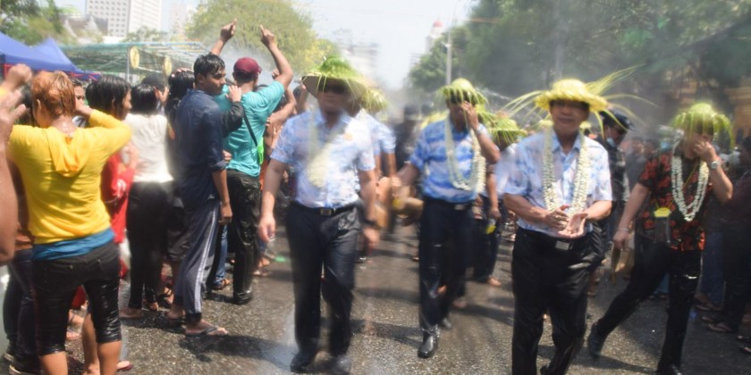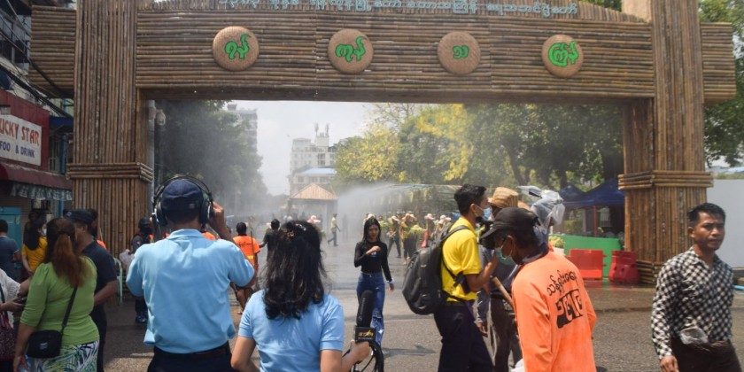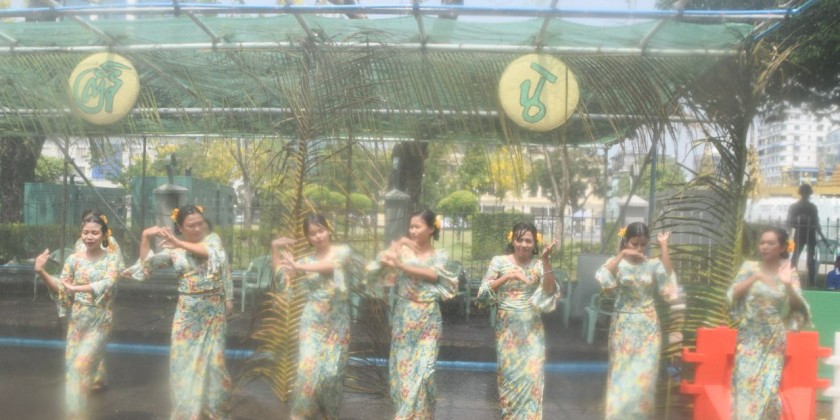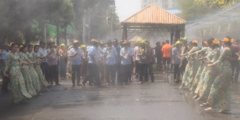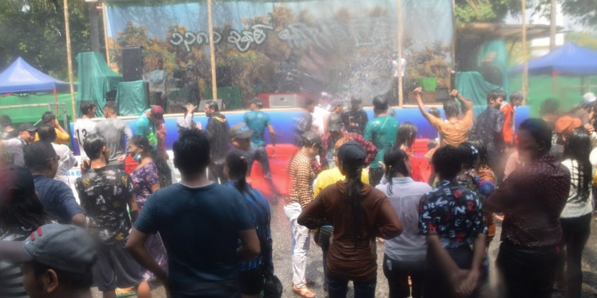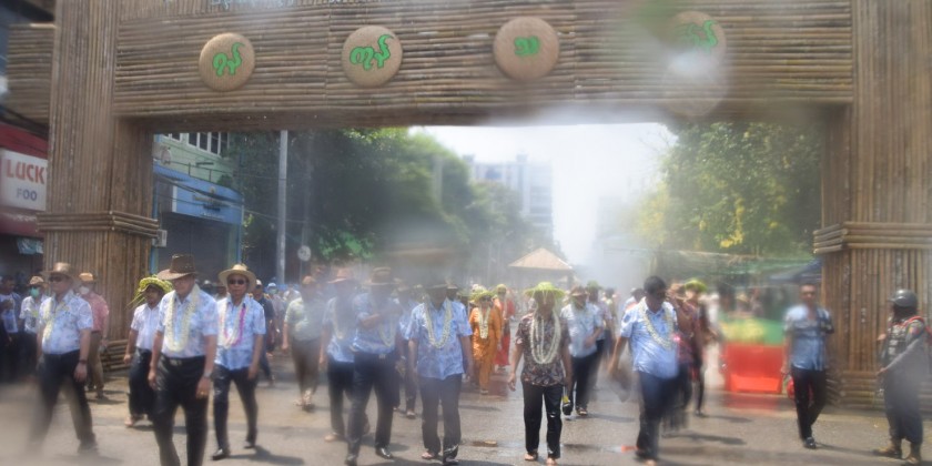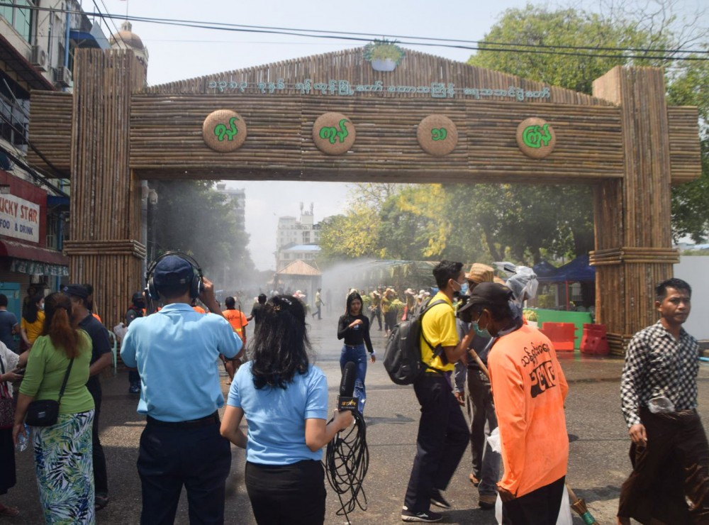 The Walking Thingyan is being held on Maha Bandhula Road in downtown Yangon. The archways and water fountains have been placed along Maha Bandhula Road till the Merchant Road.