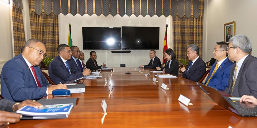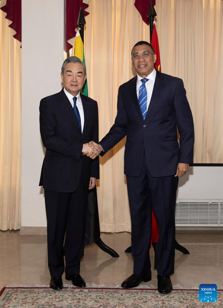 Chinese Foreign Minister Wang Yi met with Jamaican Prime Minister Andrew Holness on Saturday in Kingston. At the meeting, Wang called for expanding cooperation in areas such as economic and trade investment, new energy, agriculture, digital economy and blue economy.