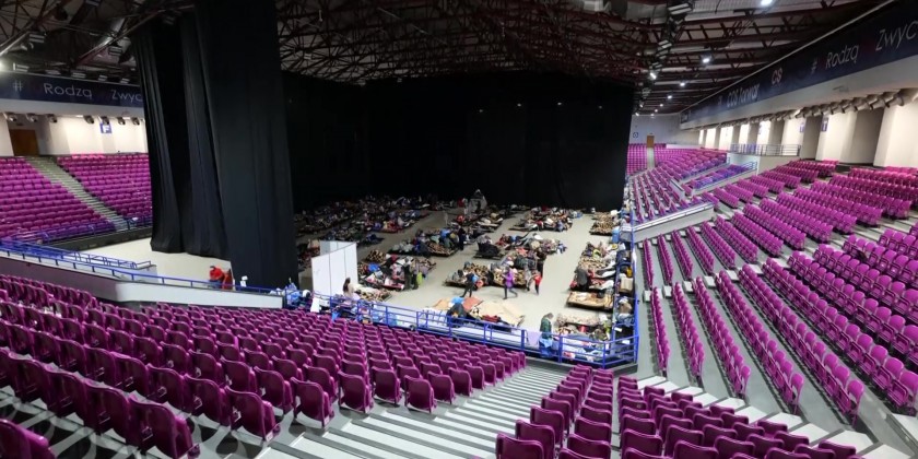 With the Polish capital overwhelmed by Ukrainian refugees, the Torwar sports center in Warsaw transformed into a shelter for those fleeing the war. Cots have been laid out in a huge arena while other areas are filled with huge piles of donated diapers, clothes and other items.