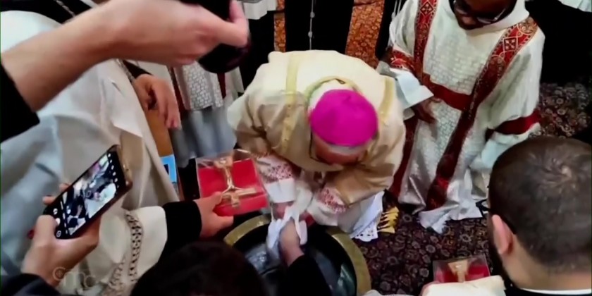 It was conducted by Latin Patriarch of Jerusalem. The washing of feet is a religious rite practiced by the hierarchy of the Roman Catholic Church. The early Christian church introduced the custom to imitate the humility and selfless love of Jesus.
