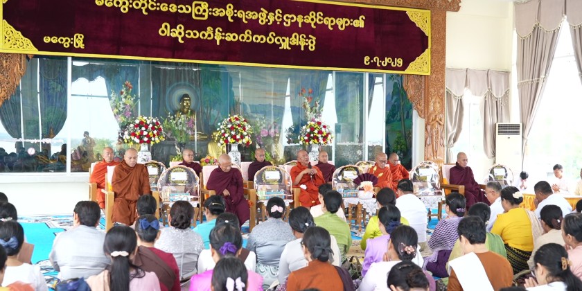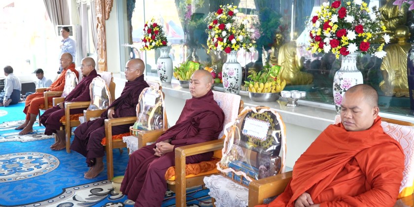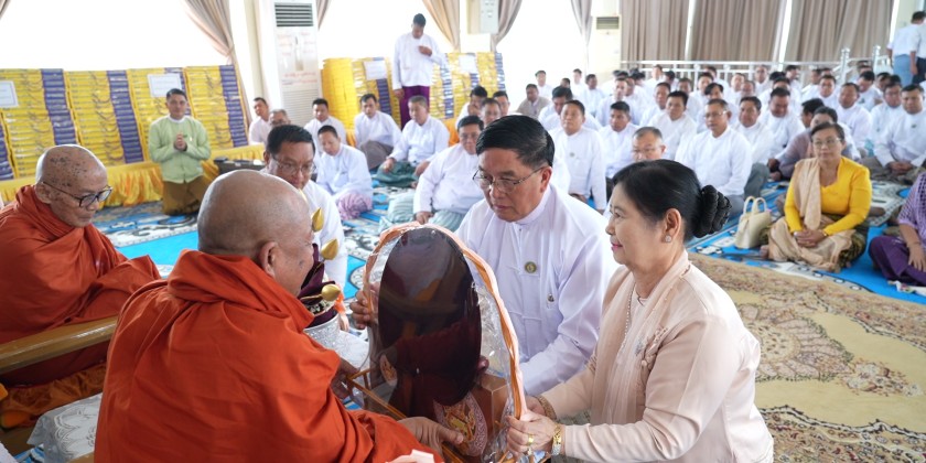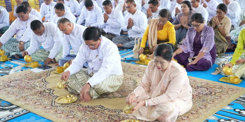 First, the Chief Minister and all invited guests observed the Five Precepts from the Presiding Sayadaw Gyi of the Sangharama သံဃာရာမ Monastery in Magway. They then listened to the Paritta suttas from the venerable Sayadaws.