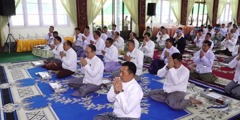The ceremony was opened by reciting Namo Sata three times. Then, the Chief Minister and congregation received 5 precepts from the State Ovada Ceriya Presiding Sayadaw of Sunlungu Kamahtan Monastery, and the members of sangha delivered Mitta Prittas.