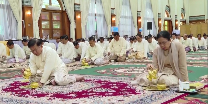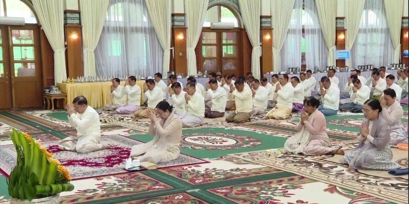 First, the Senior General paid homage to the Buddha Image and offered alms, flower, water and oil light. Then, the congregation led by the Senior General received the nine precepts from the Chairman of the State Sangha Maha Nayaka Committee, Presiding Sayadaw of Thanlyin Min Kyaung Monastery, and listened to the sermons delivered by the Sayadaws.