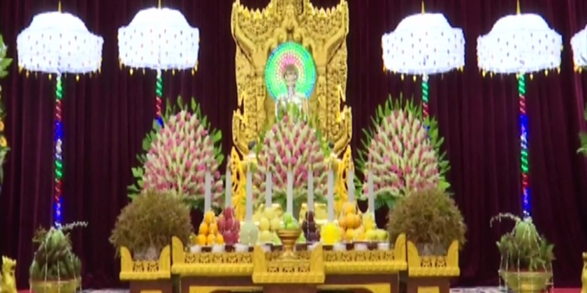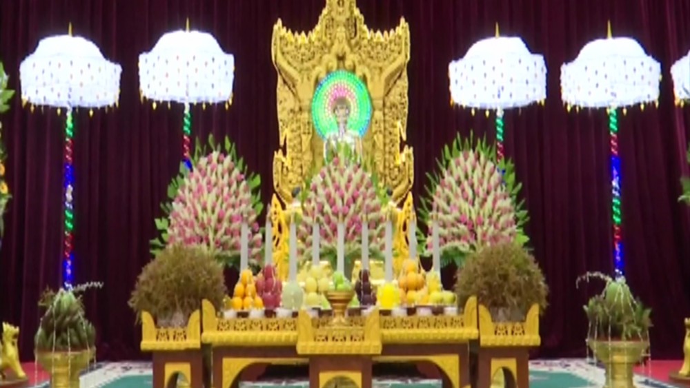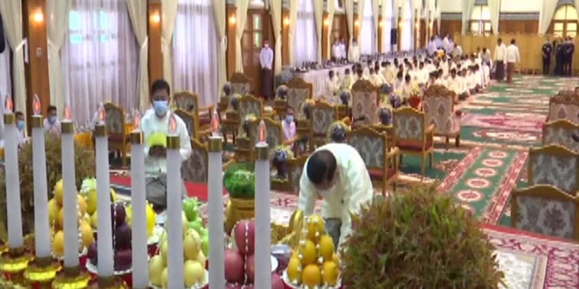 During the ceremony, the Senior General and wife offered meals, flowers, water and oil light to the Buddha image. Chairman of the State Sangha Maha Nayaka Committee [SSMNC] Presiding Nayaka of Bhamo Monastery of Mandalay Bhamo Sayadaw administered the Nine Precepts.