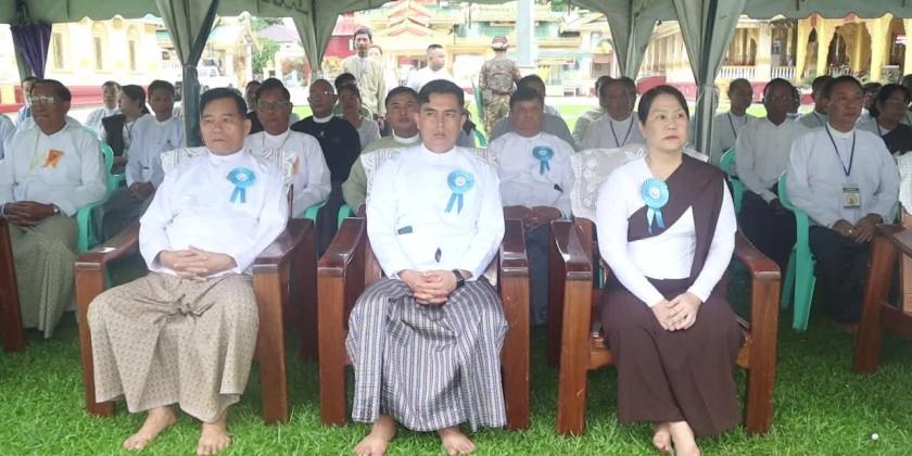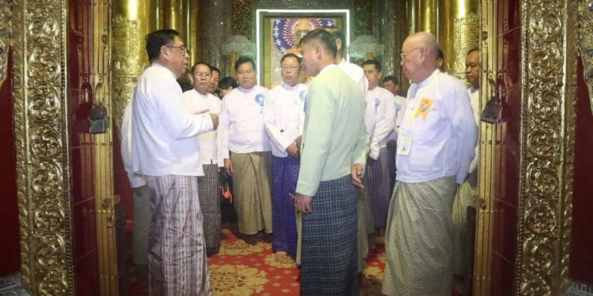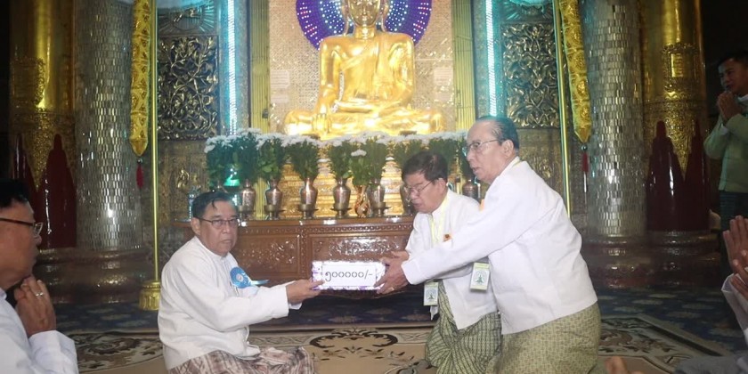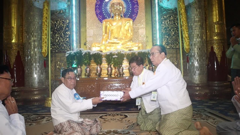 First, the Region Chief Minister U Myat Ko pad homage to the Buddha image at the Lokamarazein Pagoda, offtered flowers, water, candle light and donated 500,000 Kyats of cash donation in commemoration of the Full Moon Day of Kasone (Buddha Day) and a Pagoda Board of Trustee accepted the donation.