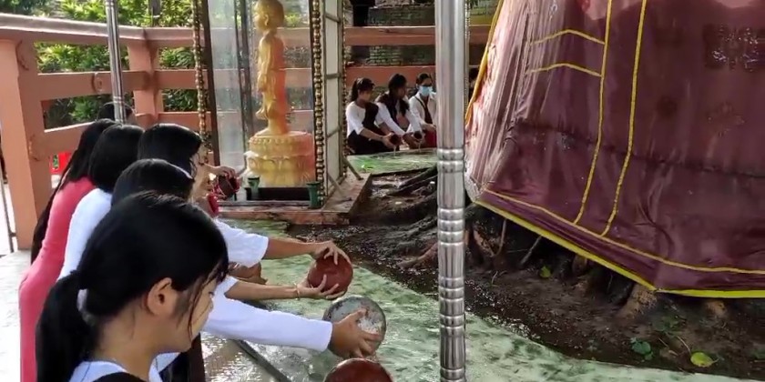 The congregation led by the region chief minister, first, recited the religious stanzas, sent loving-kindness and poured the water to the Bodhi trees.