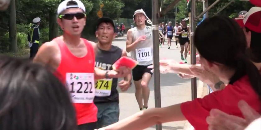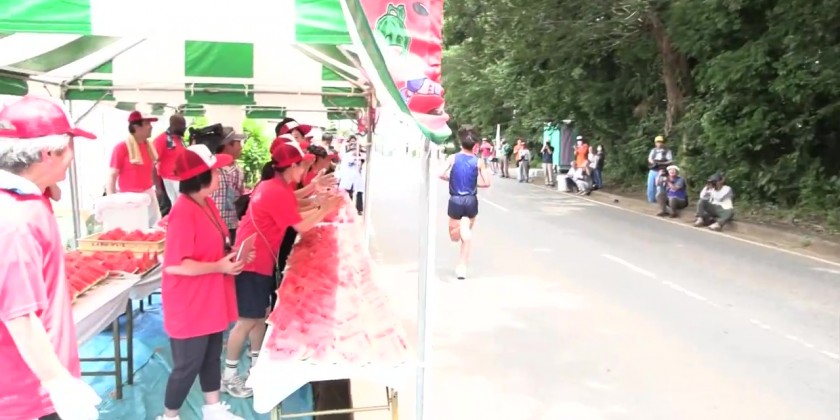 About 5,800 people from across Japan took part in the 1.5- or 10-kilometer events. Runners were offered slices of watermelon instead of water at stations along the courses to get hydrated. Some participants wore headgear or hand-made costumes featuring watermelon themes.