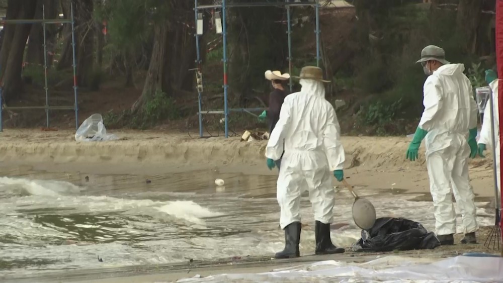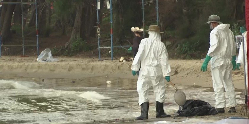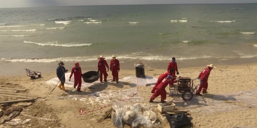 Favorable wind and sea conditions kept an oil slick away from beaches in eastern Thailand on Sunday. Emergency workers were seen on Mae Ramphueng beach in Rayong removing sand contaminated by oil which had washed ashore the previous day.