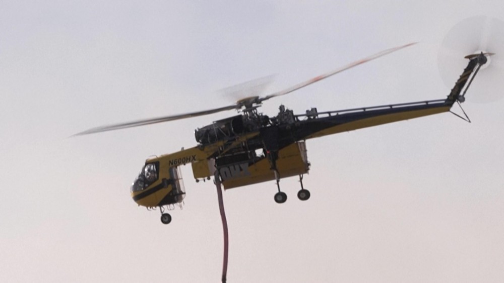 California Fire and Los Angeles County Fire Department waterbombing helicopters continued to make water drops on the Franklin fire over Malibu.
