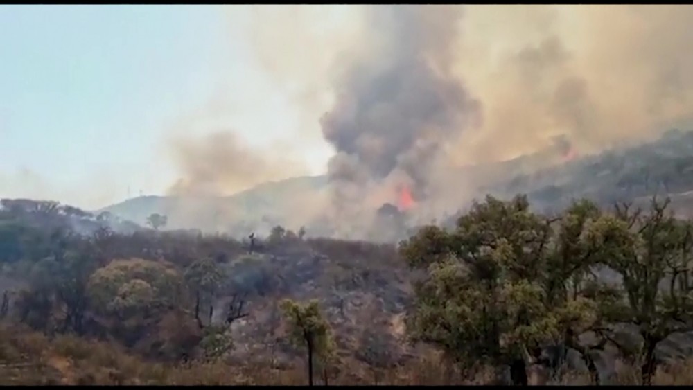 Other footage shows smoke rising at Guadapero, in the Salamanca area of the Castilla y León region. A heat wave hitting Spain and Portugal has created conditions for flames to spread more quickly and hampered efforts to control it. Authorities are linking these more frequent, more intense and more prolonged heat waves to climate change.