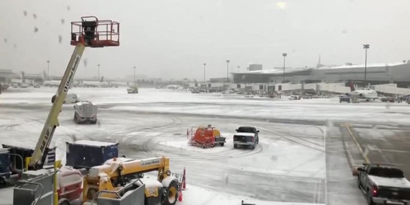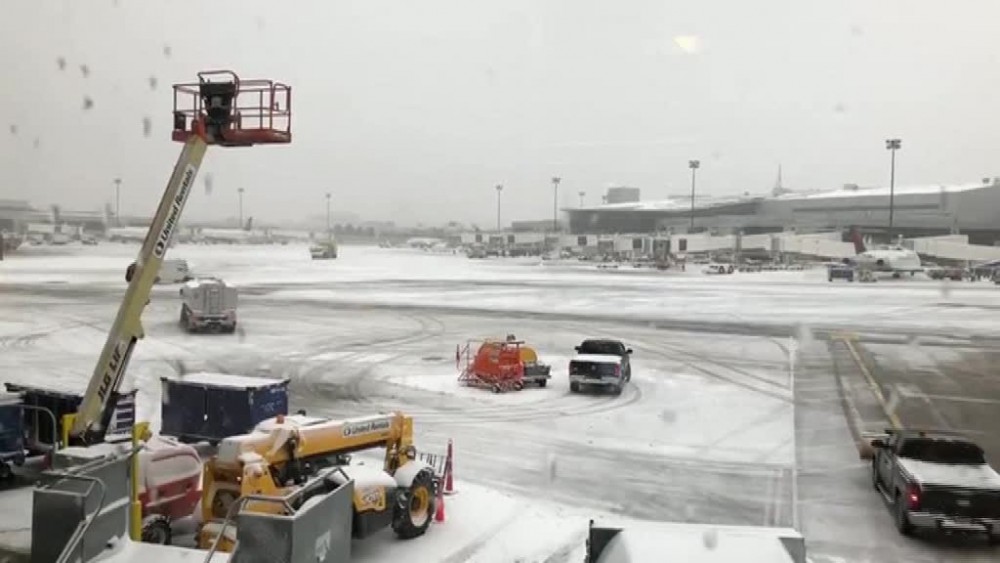 Heavy snowfall hit across the United States on Tuesday, causing flight delays and blocking highways. Videos shot during a flight from Boston, Massachusetts to Los Angeles, California show the long-lasting snowfall from inside the plane.