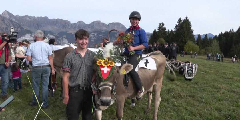 In Flumserberg of Switzerland, nine cows and their female riders’ line up at a start marked out with hay -- all hoping to claim the crown of the "Cow Grand Prix". The prizes: a 40-kilogram sack of feed for the ruminant, a traditional Alpine cowbell and a bouquet of fresh flowers for the riders in this race open exclusively to women. It is not a traditional horse race, but an all-female competition that is part of the local Alpine Cheese Market festival.
