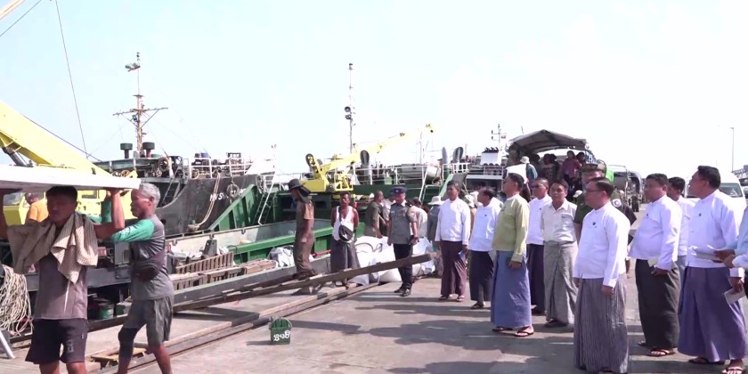 In the afternoon, the Chief Minister and party attended a work coordination meeting on construction at Kyauk Tan (1) and (2) Dams in Maday Island of Kyauk Phyu Township. The Chief Minister heard reports on dam construcion projects and future plans and coordinated the needs. At the multi purpose port terminal in Sittwe, the Chief Minister and party inspected the loading process of solar panels, rice and basic foodstuff, transported from Yangon.